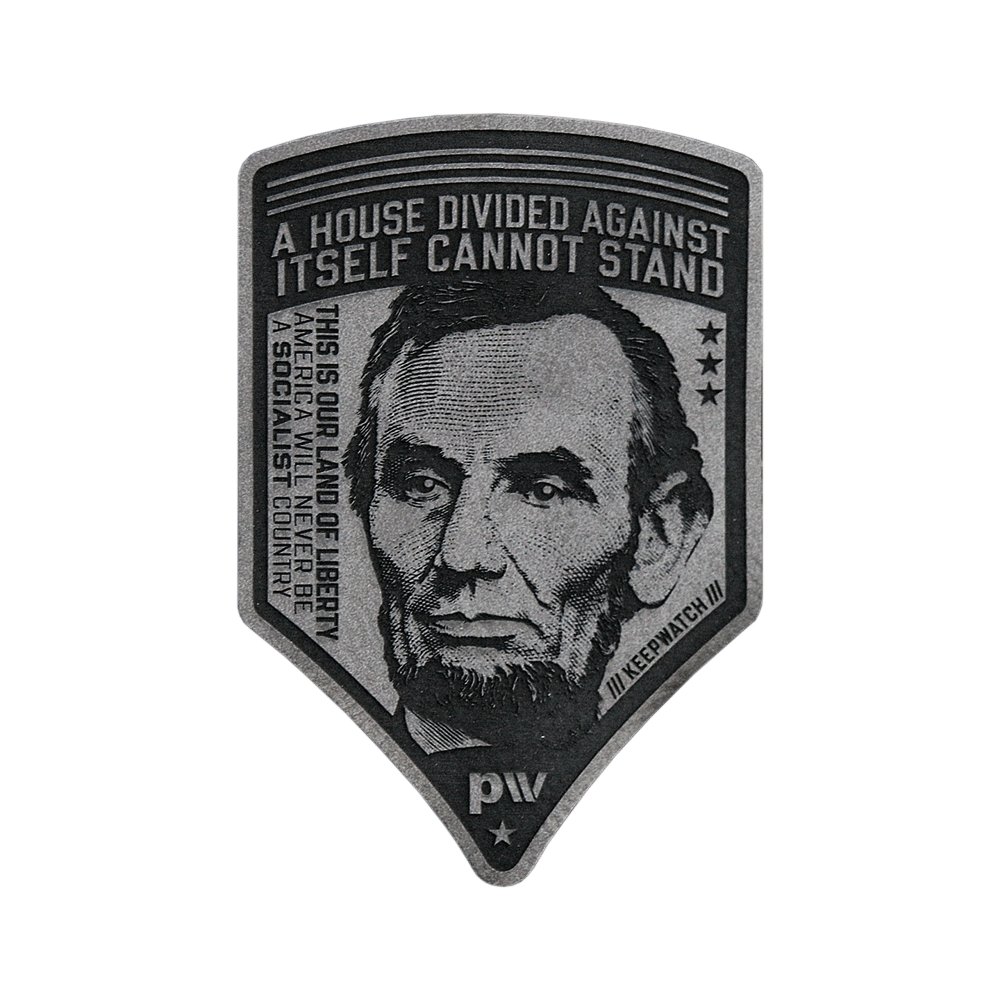 This special edition patch is made with the famous Lincoln quote "A House Divided Against Itself Cannot Stand". This is very fitting quote especially today, as our politicians have divided themselves, our countrymen, and our nation as a whole not on one issue but many.